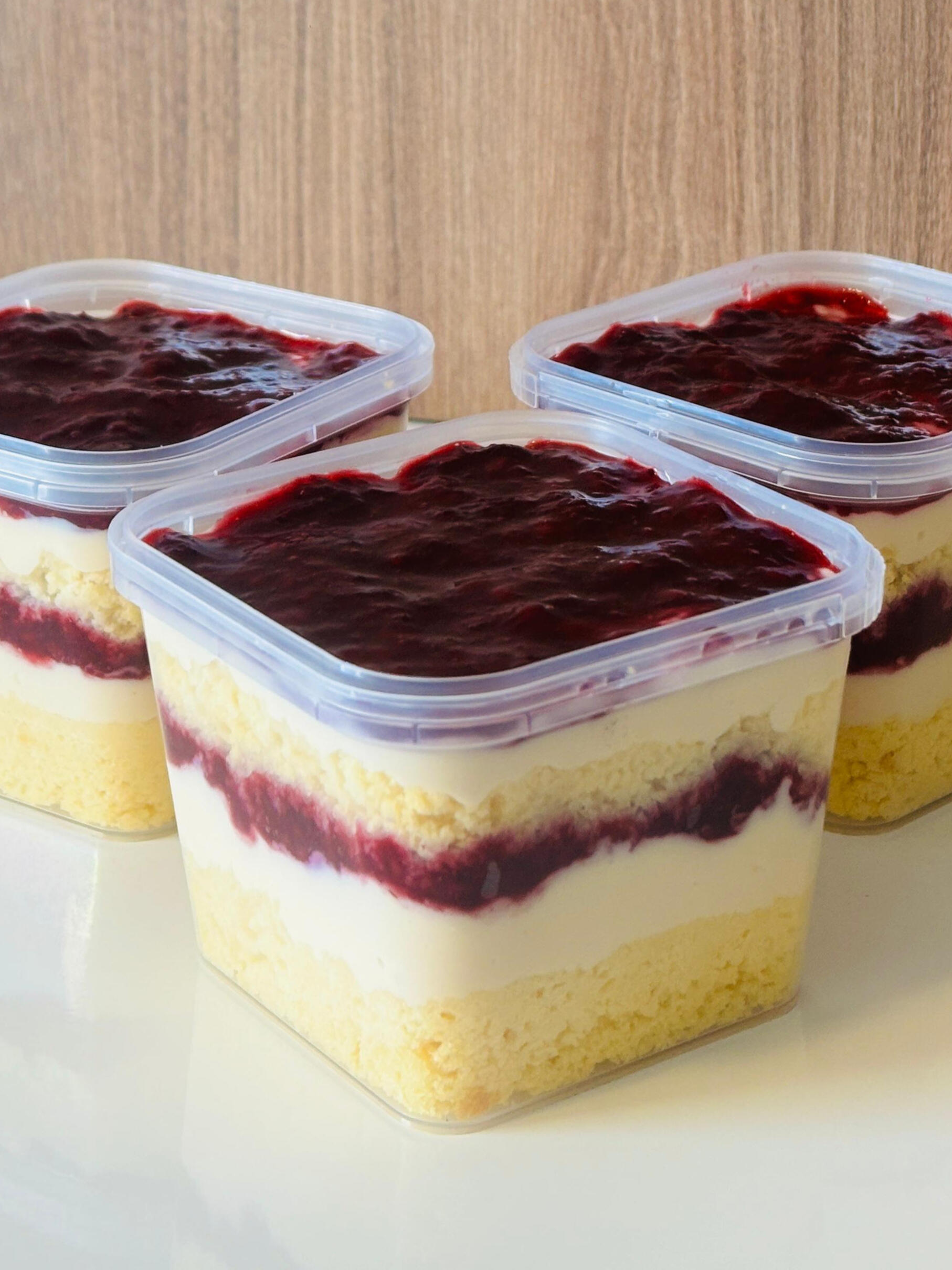 Bolo de Pote Ninho com Frutas Vermelhas: massa branca, creme de ninho e geleia de frutas vermelhas. Peso aproximado: 230g.