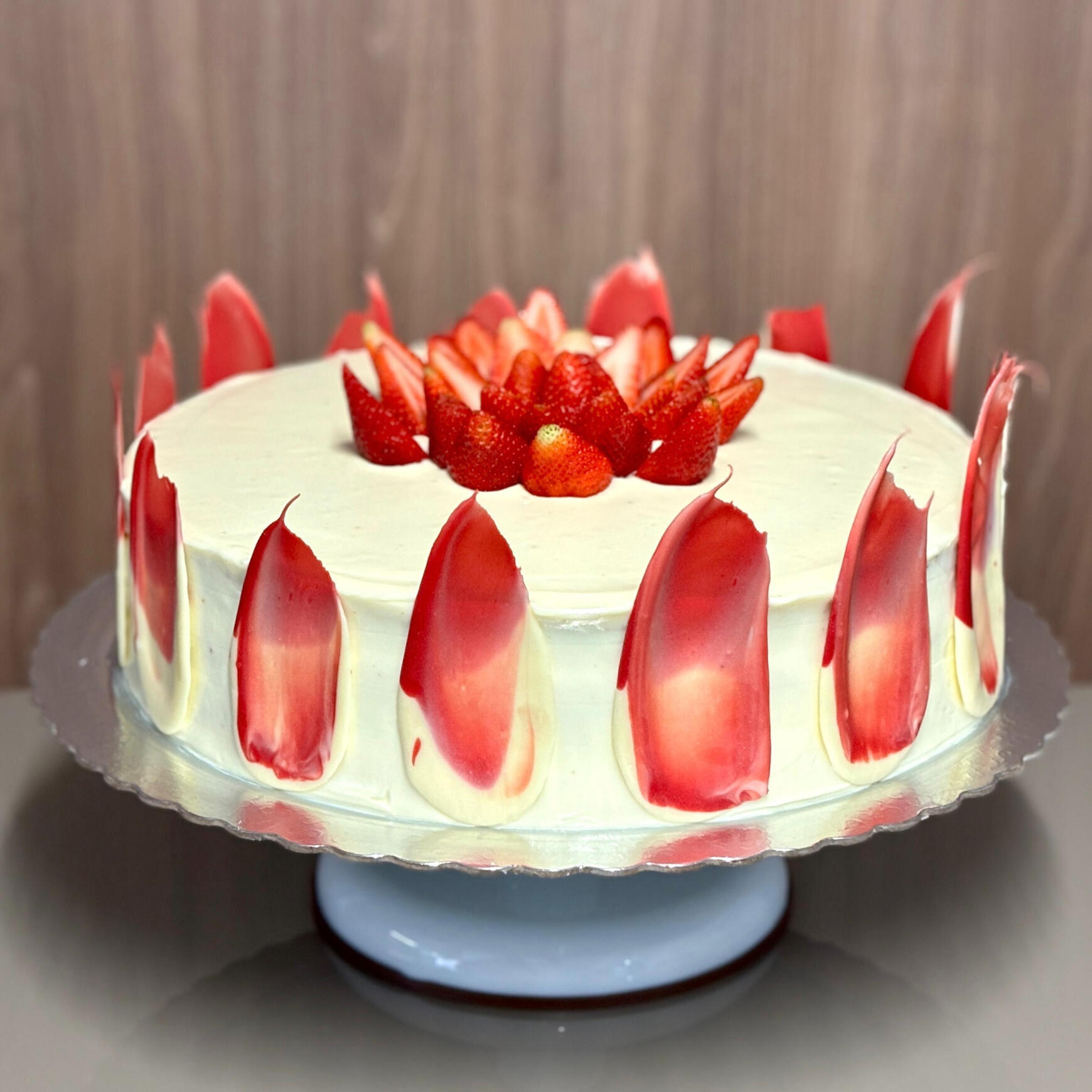 Massa sequilho crocante, recheio de mousse de chocolate, mousse de chocolate branco e geleia de morango, finalizada com pasta de baunilha e ganache meio amargo.